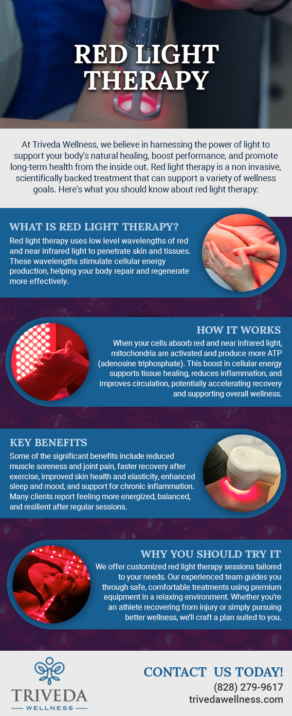 We offer red light therapy services to those in the Asheville, North Carolina area. Reach out to us at Triveda Wellness today to schedule a consultation and find out if this innovative therapeutic technique is right for you, or book a session with us now below!